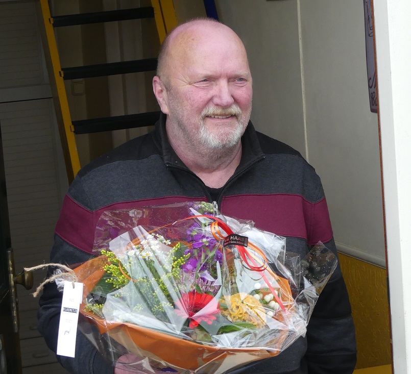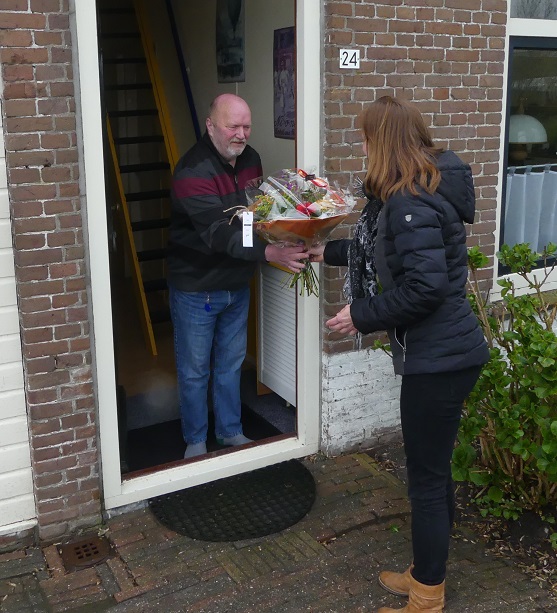Het bestuur van dorpsbelang Folsgeare is van mening dat deze bijzondere gelegenheid een felicitatie waard is. Dhr. Koopmans was blij verrast toen Martje Grafhorst en Wytske Heida voor de deur stonden met een mooi boeket en de fotocamera in de aanslag.