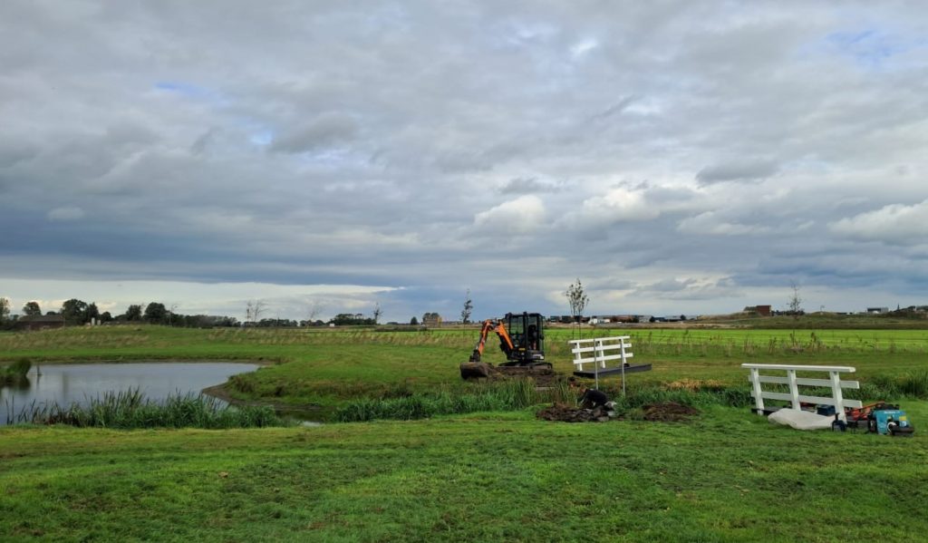 Op woensdag 25 september is in het wandelpad door het Landschapspark een bruggetje geplaatst over het water bij Strûpenkeal. Er kan voortaan een nog mooier rondje worden gelopen door het gebied. Hoewel het pad soms niet erg goed te vinden is, heeft Douwe de Groot van de gemeente SWF ons verzekerd dat het helemaal goed komt. Hoe meer mensen er gaan wandelen, des te beter wordt het pad zichtbaar vanwege de afwijkende vegetatie.